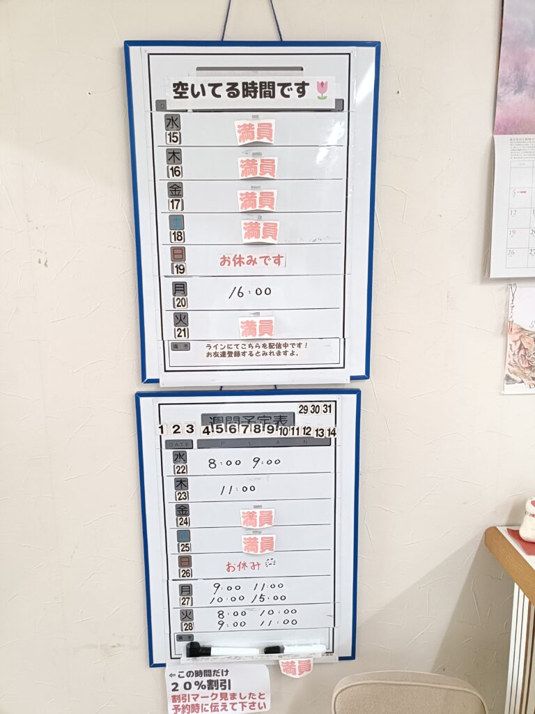 前日や当日のキャンセルがでたら、割引のチャンスなのでこまめに空き情報をチェックしていると普段よりお得に施術をうけれますよ(^^♪ この割引マークは要チェックです!